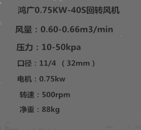 此款型號(hào)(HC-40S回轉(zhuǎn)風(fēng)機(jī))所配套為4級(jí)純銅國(guó)標(biāo)品牌電機(jī)0.75kw,電機(jī)不耐濕,請(qǐng)保持電機(jī)干燥,注意電機(jī)轉(zhuǎn)向應(yīng)與風(fēng)機(jī)轉(zhuǎn)向標(biāo)志一致。本產(chǎn)品電機(jī)配置均為380V電源。有需要220V電源事先說明。默認(rèn)按照380V電源配置電機(jī)。