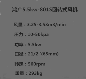 此款型號(HC-801S回轉(zhuǎn)風機)所配套為4級純銅國標品牌電機5.5kw,電機不耐濕,請保持電機干燥,注意電機轉(zhuǎn)向應與風機轉(zhuǎn)向標志一致。本產(chǎn)品電機配置均為380V電源。有需要220V電源事先說明。默認按照380V電源配置電機。